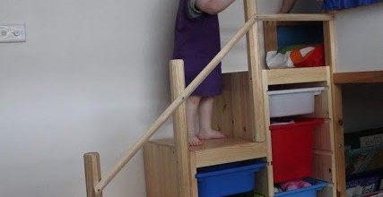Materials: Kura, Trofast, bits of wood railings Description: I needed to figure a way to save space in my girls bedroom but the problem with the Kura bed we had was that my daughters could not climb up or down the ladder to get into or out of the bed. We bought a Trofast storage unit as a replacement for the stairs. It worked great! They could both climb up and down into the bed but to make it safer … Continue reading Ladder into steps