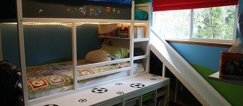 Materials: Kura bed, Kura tent, Trofast Frames (3) Description: The bed is the Ikea Kura bed with optional tent attachment up top. I had painted all the blue panels of the original bed with chalkboard paint and the natural wood frame with semi-gloss white paint when we first bought the bed. The bed now sits on a plywood platform (2 cut pieces actually since one wasn’t quite big enough) that rests on three Ikea Trofast frames. The plywood is also … Continue reading Kura bed with slide