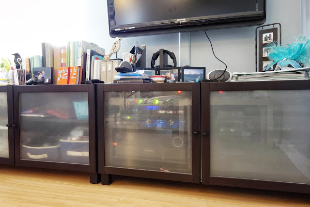 Description: Anticipating the arrival of our adopted son, I had foolishly decided that I wanted to get 2 desktop computers, a house automation server, home theater pc, AV receiver, PS3, gigabit switch, VOIP phone, and the network radio in our living room out of the open so that he wouldn’t be able to mess with them. Instead of having a large server rack in a cabinet in the corner of our living room, I decided to come up with something that would match the aesthetics of our Ikea furnished home.